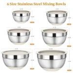 This bowl set is made of high quality, thick stainless steel that ensures safety and durability. No matter what you are mixing, grating, dough or baking, 6 sizes nesting mixing bowl stainless steel set for all your storage needs. It is kitchen essentials for new home!